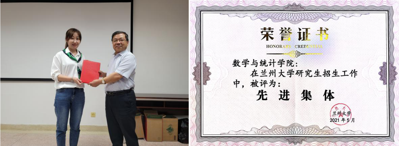 根据兰州大学《学院研究生招生工作过程考核方案(试行)》(校研〔2018〕64号),数学与统计学院2019-2020年度的招生工作过程及生源质量得到了学校的充分肯定,荣获先进集体荣誉称号。