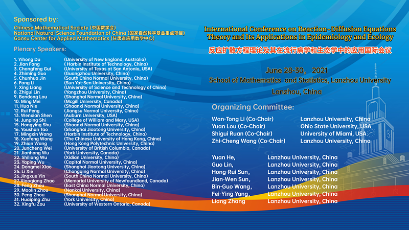 2021年6月28日至30日,经教育部批准,受兰州大学、中国数学会、国家自然科学基金重点项目资助,由甘肃应用数学中心、9227新葡的京集团主办的“反应扩散方程理论及其在流行病学和生态学中的应用国际会议(International Conference on Reaction-Diffusion Equations Theory and Its Applications in Epidemiology and Ecology)”以腾讯会议线上形式成功举办。一百多位来自美国、加拿大、澳大利亚以及中国香港和内地的专家学者、青年教师和研究生参加了本次会议,三十多名学者做了学术报告,其中包括来自加拿大皇家科学院院士、英属哥伦比亚大学魏军城教授,澳大利亚科学院院士、新英格兰大学杜一宏教授,美国德克萨斯大学桂长峰教授,美国俄亥俄州立大学楼元教授,美国迈阿密大学阮士贵教授,美国奥本大学沈文仙教授,美国威廉玛丽学院史峻平教授,加拿大应用数学研究主席、约克大学吴建宏教授,加拿大纽芬兰纪念大学赵晓强教授,加拿大麦吉尔大学梅茗教授,以及香港理工大学、香港中文大学(深圳)、中国科学技术大学、上海交通大学、南开大学、中山大学、哈尔滨工业大学、华南师范大学、西安电子科技大学、上海师范大学、首都师范大学、广州大学、江苏师范大学、重庆师范大学等国内著名院校的专家学者。