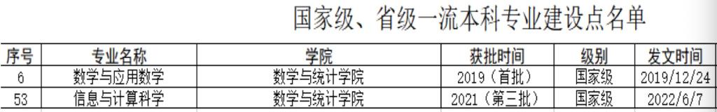 近日,教育部发布了《教育部办公厅关于公布2021年度国家级和省级一流本科专业建设点名单的通知》,我院信息与计算科学专业入选第三批国家级一流本科专业建设点。这是我院继2020年数学与应用数学专业获批国家级一流本科专业建设点以来学院专业建设取得的又一重要突破。截止目前,我院现有本科专业已实现国家级一流本科专业建设点全覆盖。