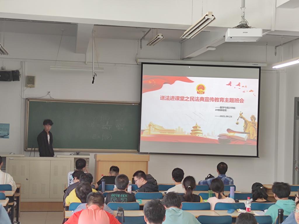 2021年9月24日,数学与统计学院2020级专业班在榆中校区天山堂A103开展法制宣传教育活动。20级专业班全体成员参加,班长高广浩主持大会。