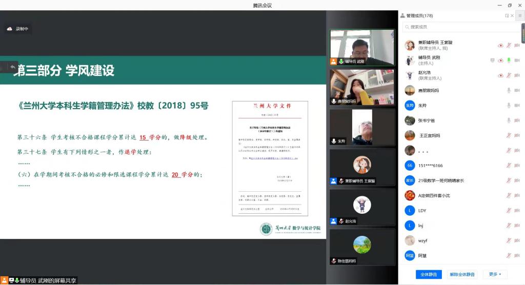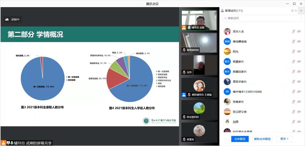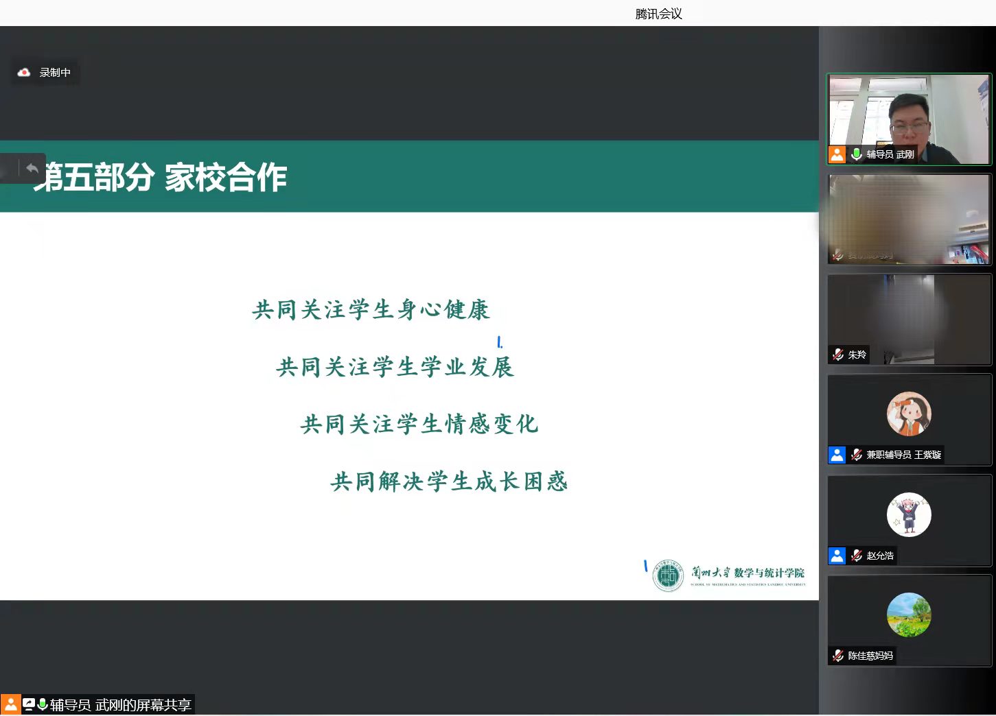 为进一步加强家校联系,及时精准反馈新生在校学习生活情况,推动家校合作迈向新台阶,12月25日下午,数学与统计学院组织召开2021级本科生线上家长会。会议由专职辅导员武刚主持,2021级全体本科生家长参加了会议。