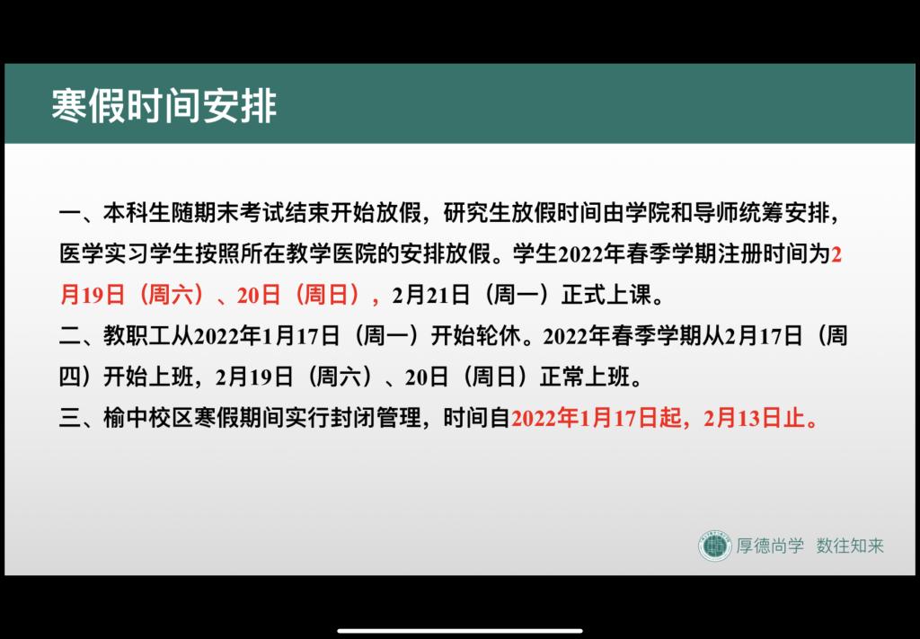 会议开始,武老师首先就近期同学们关注的期末考试安排、假期离校流程、核酸检测服务、假期注意事项等问题进行解答,并要求各位同学按照学校要求规范离校、安全返家。其后,对于毕业生毕业派遣事宜进行了详细讲解,并嘱咐各位同学务必按照要求完成就业流程各事项,以免影响毕业手续。