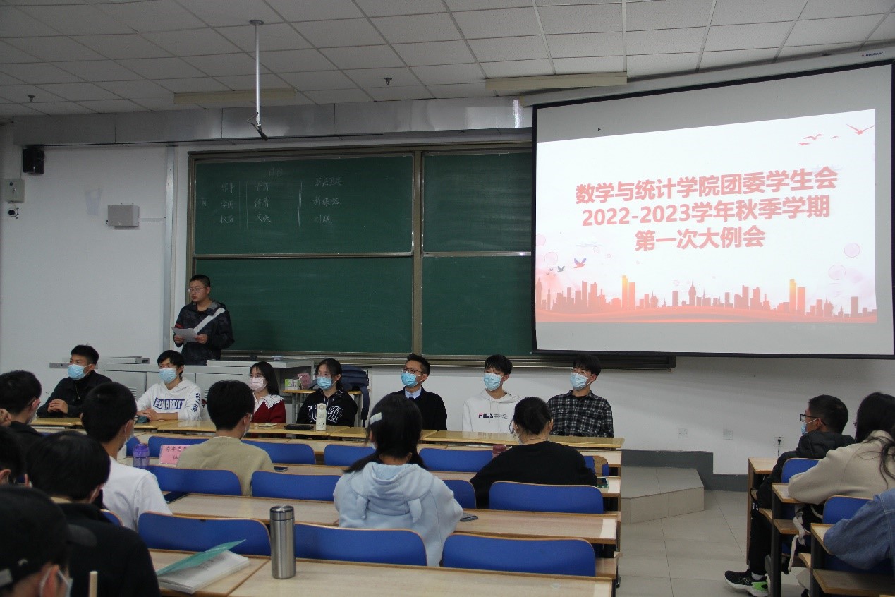 2022年11月5日晚上19:00,为了更好的开展团委和学生会的工作,促进新成员对部门工作的深入认识,数学与统计学院团委学生会在天山堂B503开展了本学期第一次大例会。大例会由数院学生会主席朱梦漪主持,2022级、2021级和2020级团委学生会成员以及各班班长参加了本次会议。